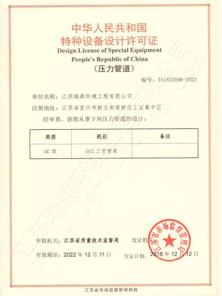 江蘇瑞鼎環境工程有限公司獲得壓力管道和壓力容器設計資質!