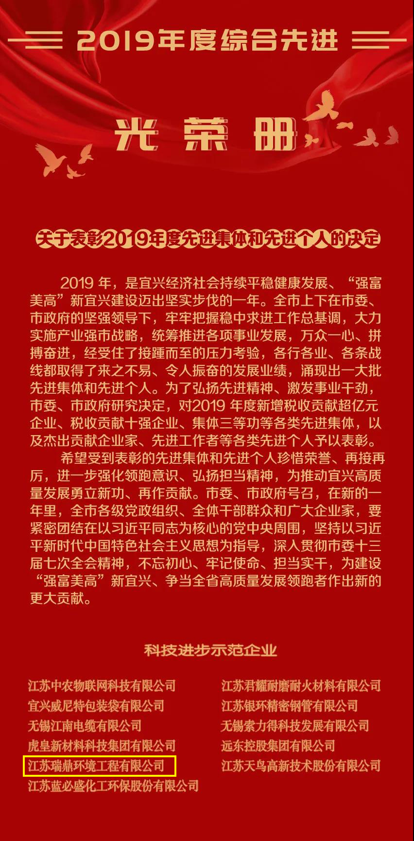 本站 近日,宜興市委、市政府經(jīng)研究決定對(duì)2019年度宜興市先進(jìn)集體和先進(jìn)個(gè)人進(jìn)行表彰。根據(jù)該表彰決定,江蘇瑞鼎環(huán)境工程有限公司被認(rèn)定為2019年度科技進(jìn)步示范企業(yè)。