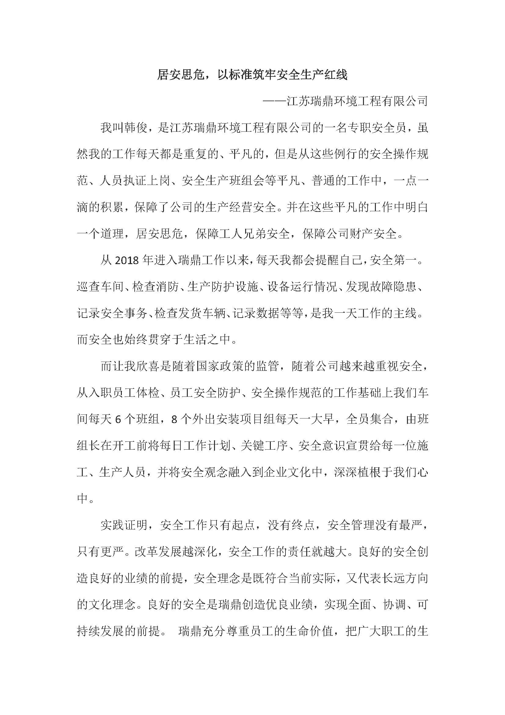 正如韓俊在文中所說,安全工作只有起點,沒有終點。瑞鼎環境各安全崗位的從業人員都要時刻緊繃安全弦,安全工作一直路上,只有在保障安全的前提下,才能確保產品質量,促進企業的平穩發展。