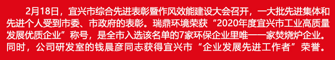 此次獲獎是宜興市委、市政府對公司發展的充分肯定,2021年,瑞鼎全體干部職工將以只爭朝夕、昂揚奮發的狀態,認真踐行“永遠確保安全達標,做焚燒行業領跑者”的價值理念,進一步強化領跑意識、弘揚擔當精神,團結奮進、拼搏進取、不負韶華,為推動宜興高質量發展勇立新功、再作貢獻。